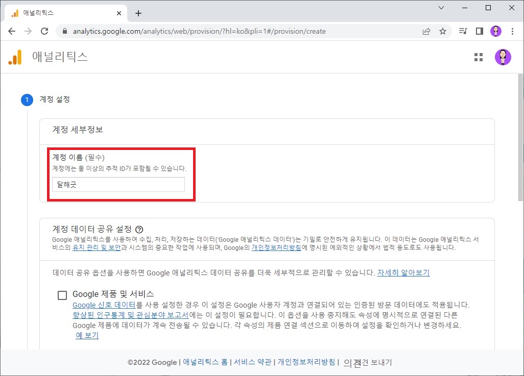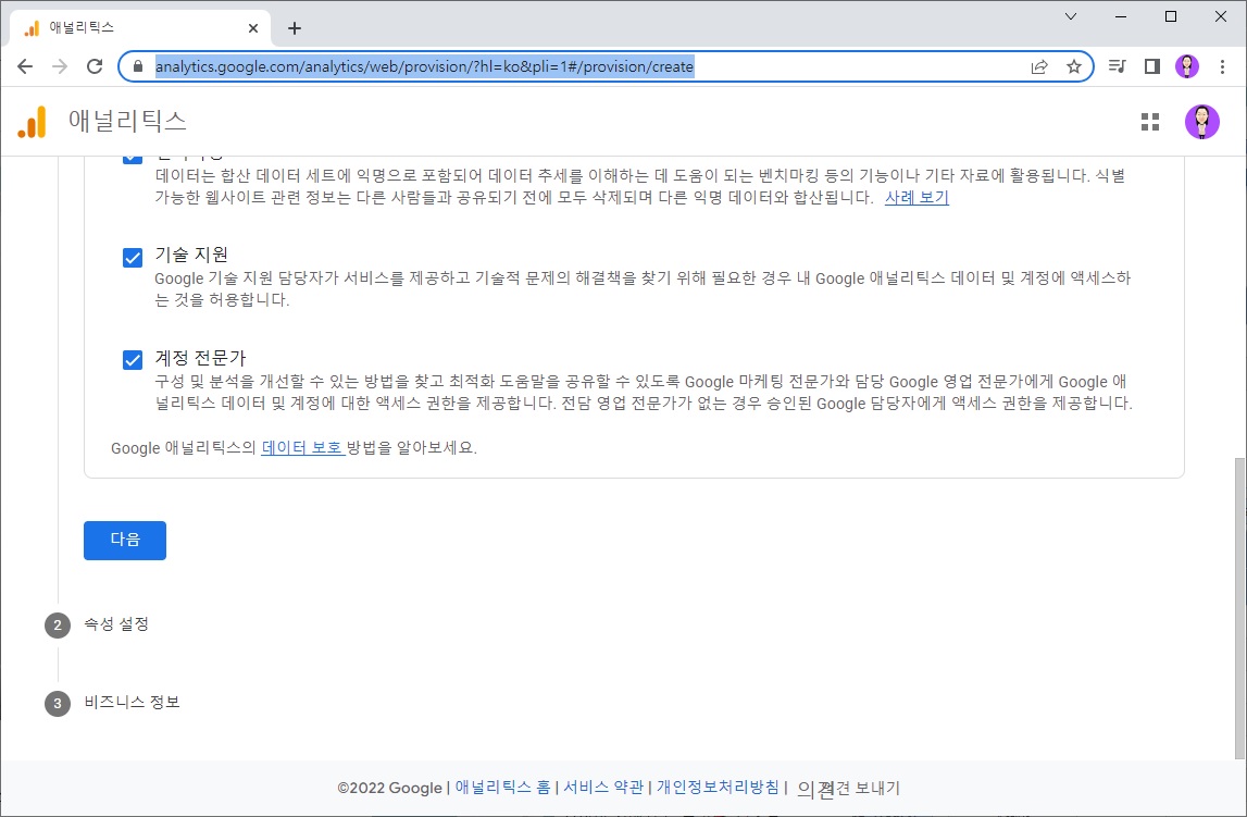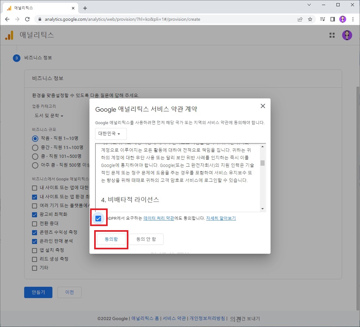마지막 단계 “구글 애널리틱스 서비스 약관 계약”에 체크하고 “동의함”을 클릭합니다.