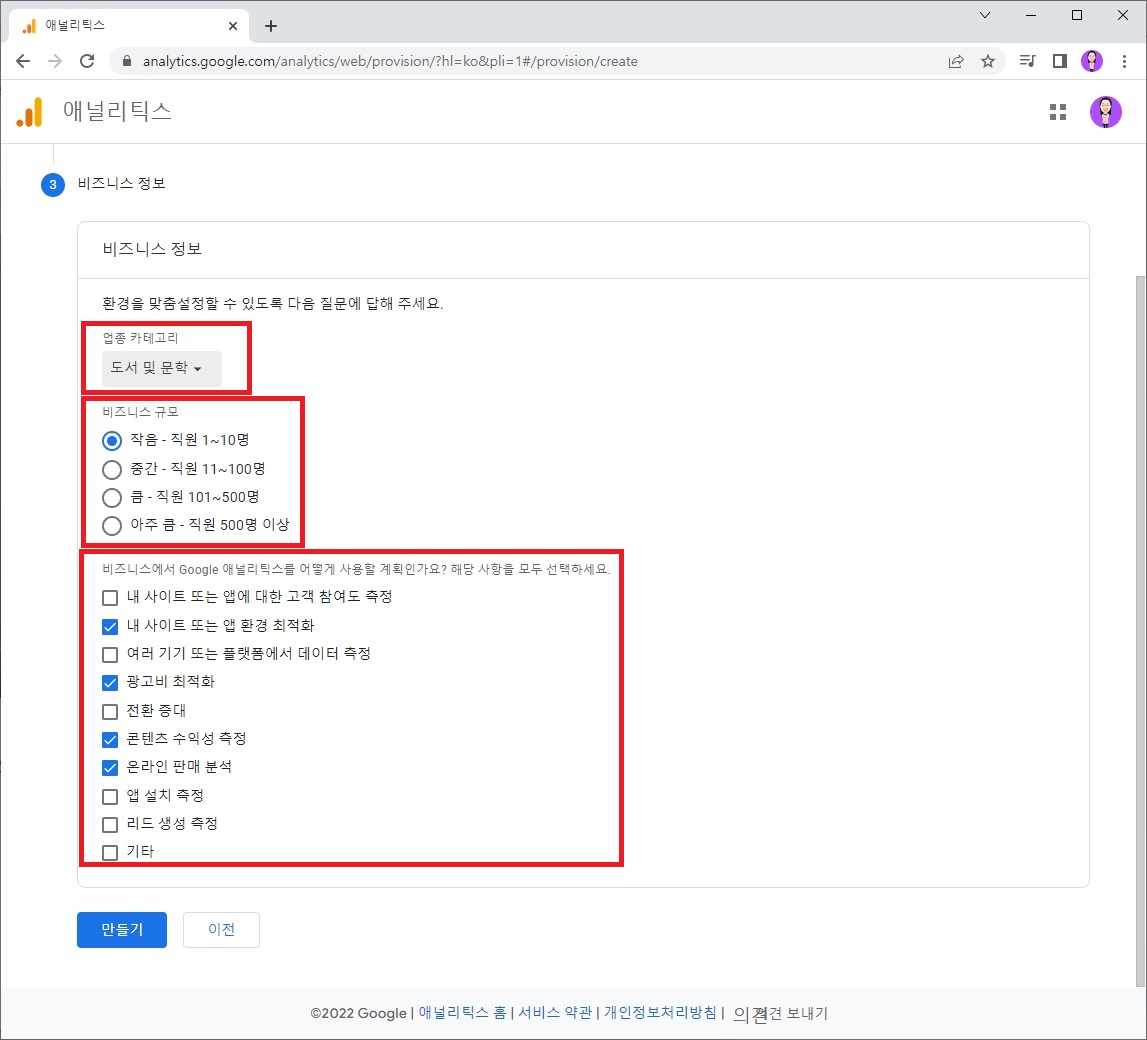 비니지스정보 대략적으로 입력하고 “만들기”를 클릭합니다.