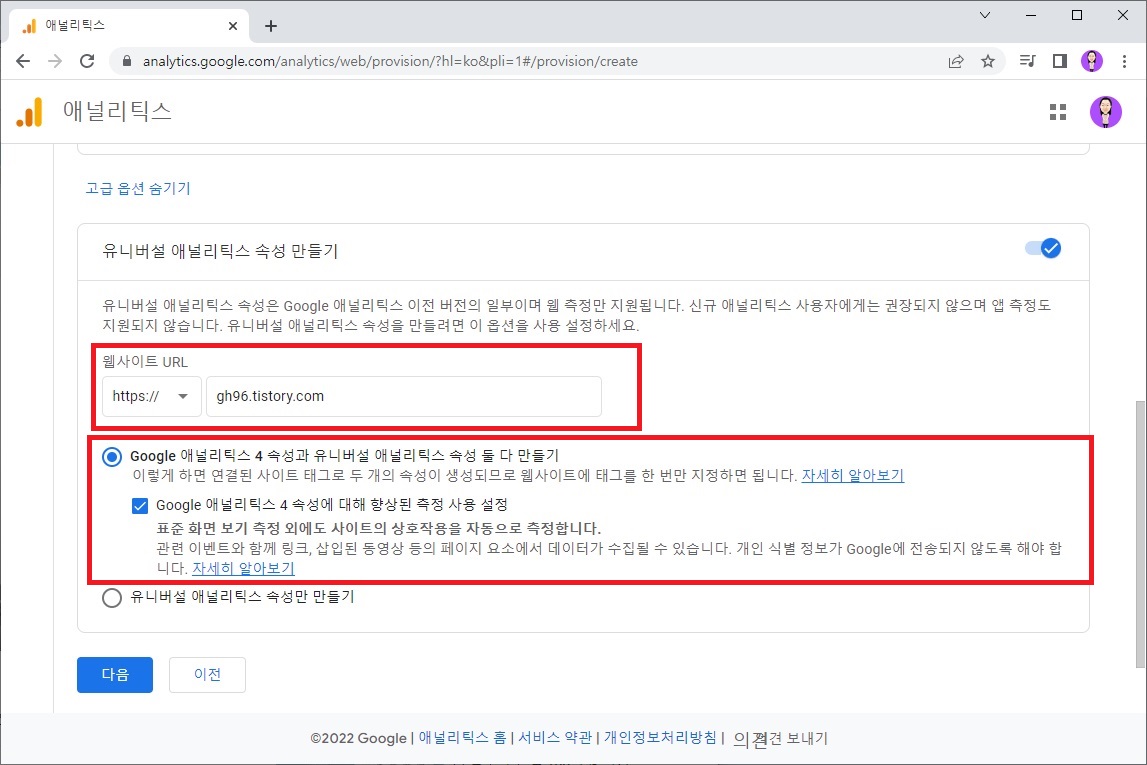 애널리틱스 신청한 웹사이트 주소를 입력합니다.