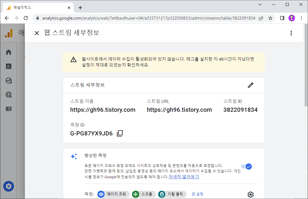 사이트가 등록되었음을 알려주는 화면이 나타나고 “측정 ID” 를 복사합니다.