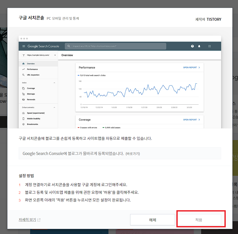 설정하고자하는 구글서치콘솔을 클릭합니다. "적용"을 눌러주면 됩니다.