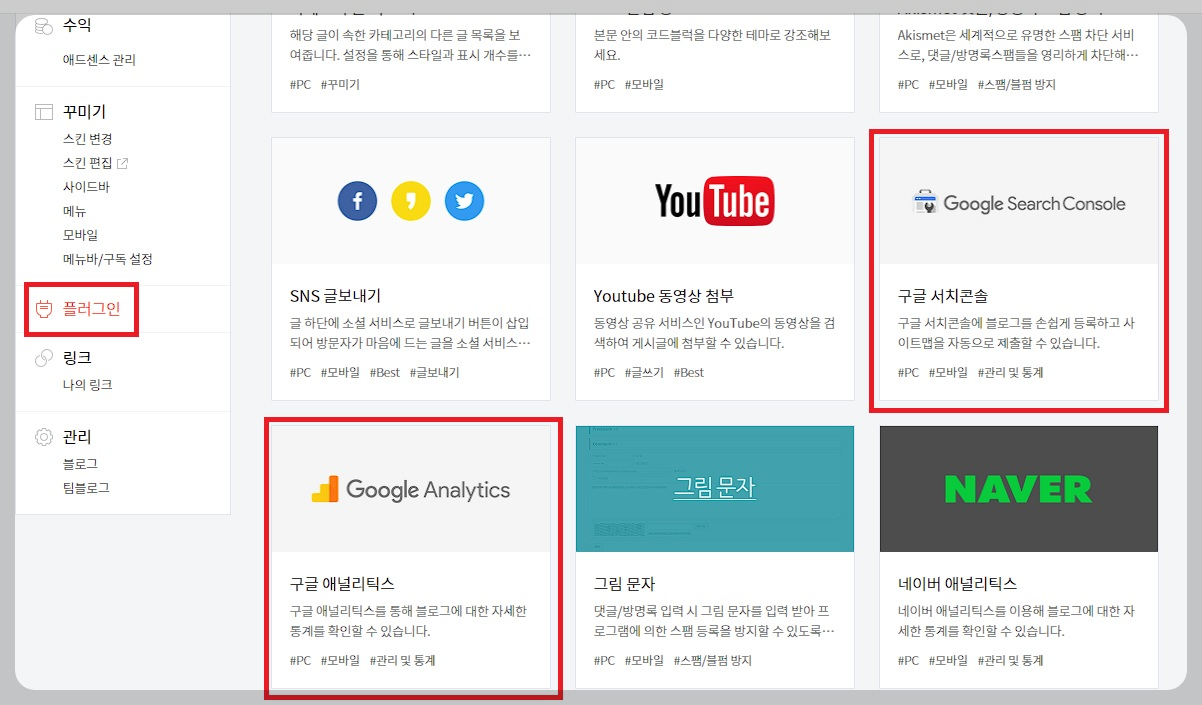 구글 애널리스틱도 동일하게 적용 설정을 합니다. 두 개의 플러그인 설정이 완료되면 “사용중”으로 표시가 됩니다.