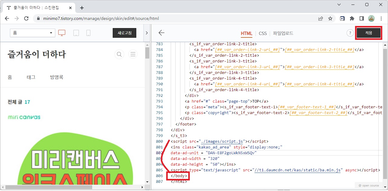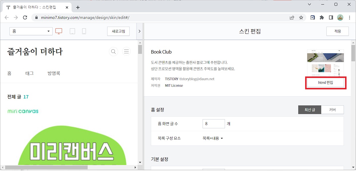 10. 내 블로그 > 관리 > 스킨 편집 > html편집 클릭합니다.