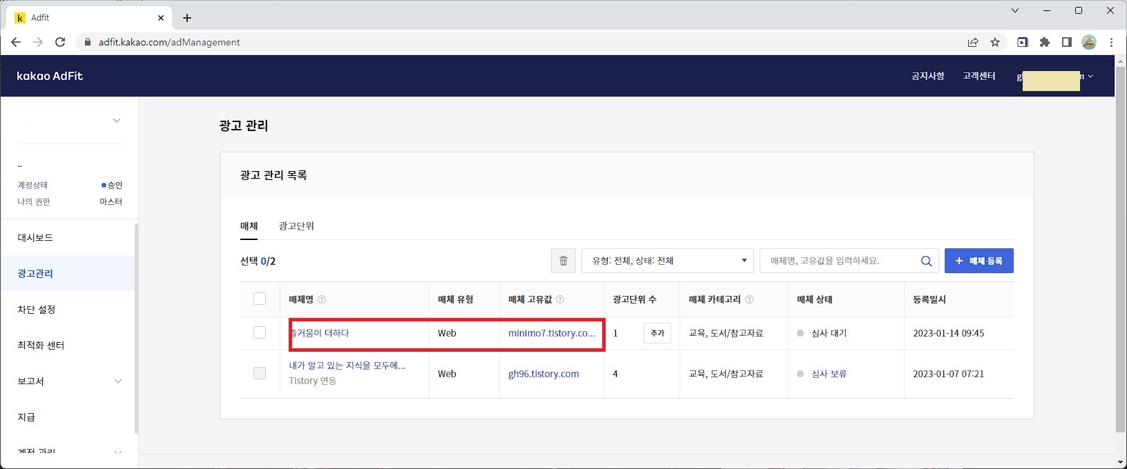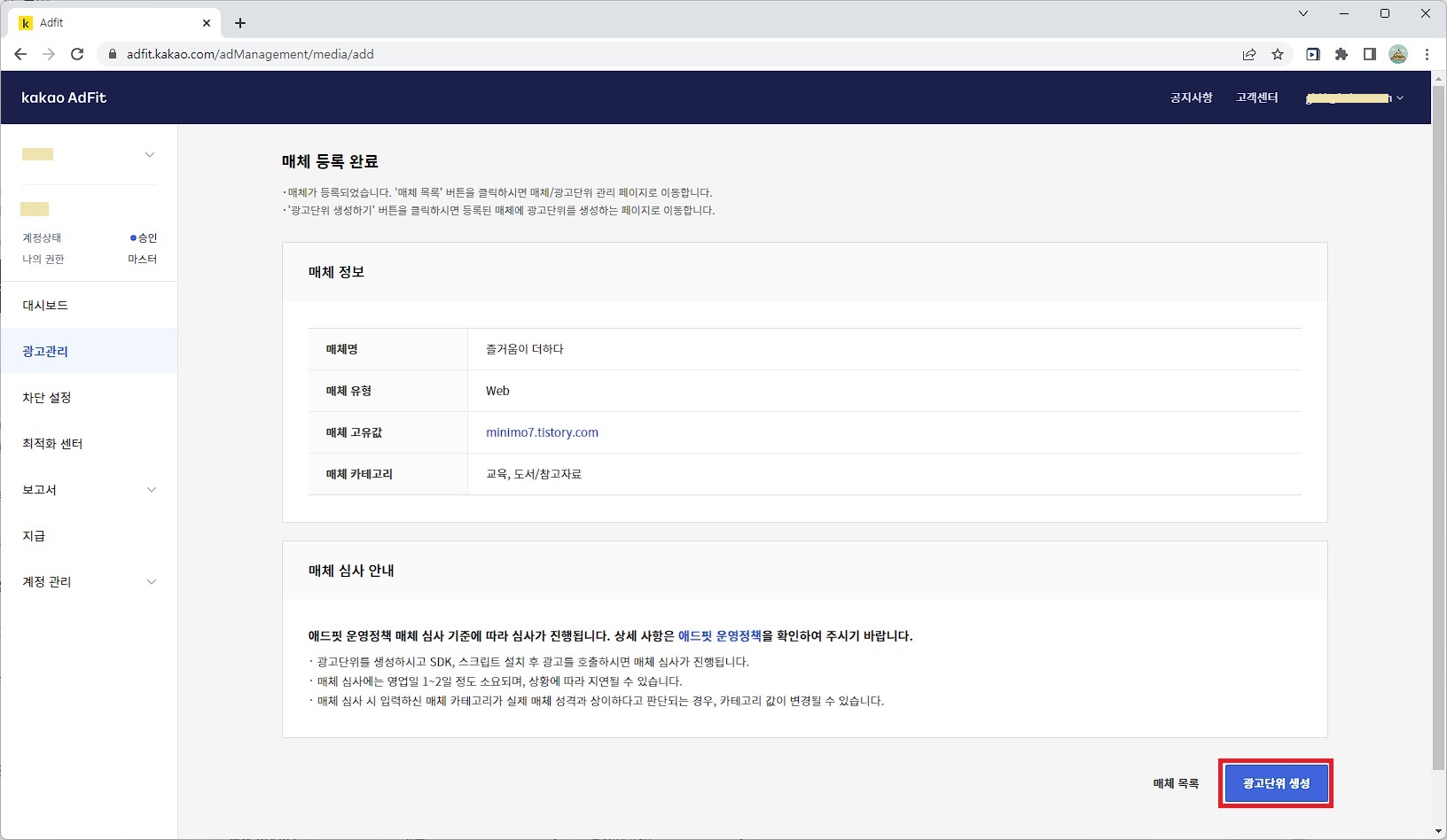 그러면 애드핏을 신청하기 위해 전 단계가 끝났습니다.