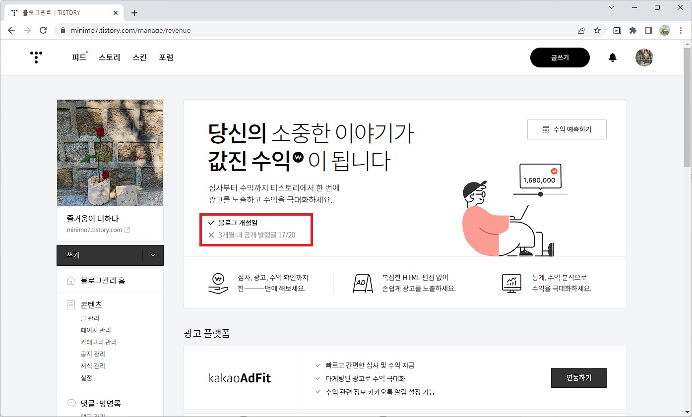 애드핏을 신청할 수 있는 조건이 미달되어 대기중입니다. 오늘 중으로 신청할 예정입니다.