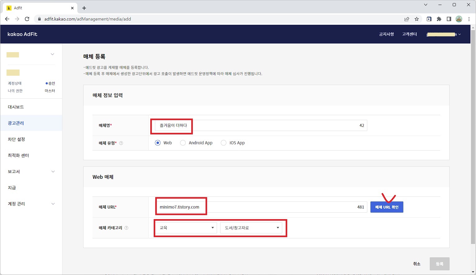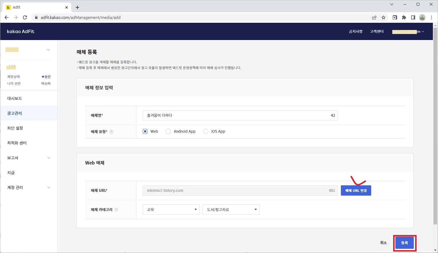 5. 매체 카테고리까지 입력 후 "등록"을 클릭합니다.