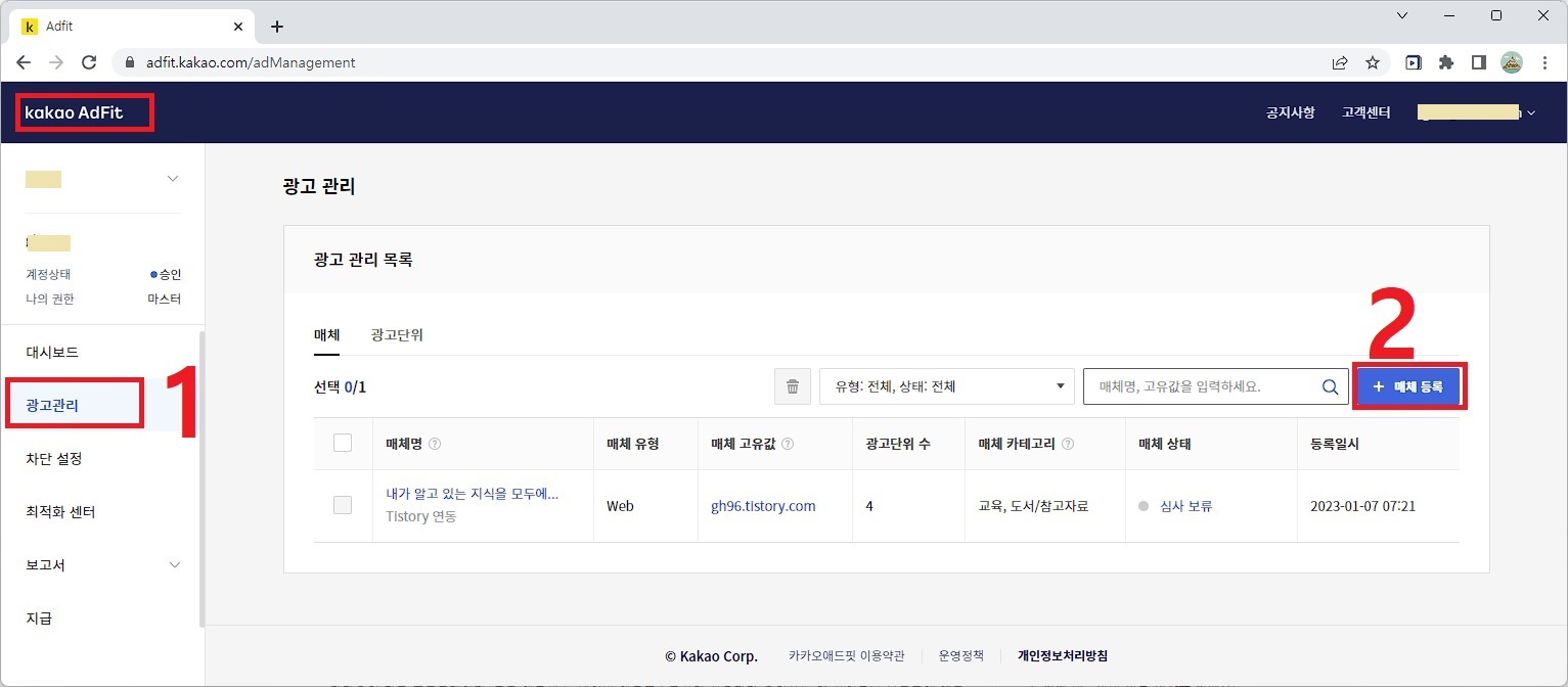 1. 애드핏 사이트에 들어가셔서 왼쪽 메뉴바에서 "광고관리" 클릭 후 "매체등록"을 클릭합니다.