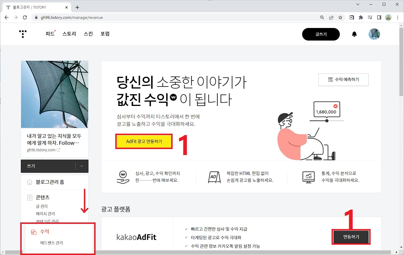 애드핏 연동 조건을 만족하니 자동으로 아래 그림에서 1번의 "AdFit 광고 연동하기"가 뜨네요.