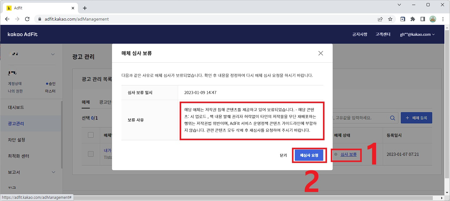 내용 확인 후 나의 포스팅글을 확인하고 해결 한 뒤 2. "재심사요청"을 합니다.