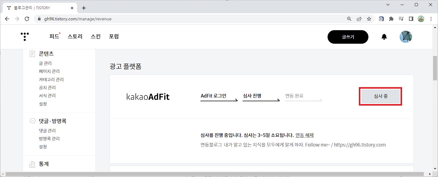 AdFit로그인 >> 심사 진행 >> 연동 완료 3단계로 진행이 됩니다.