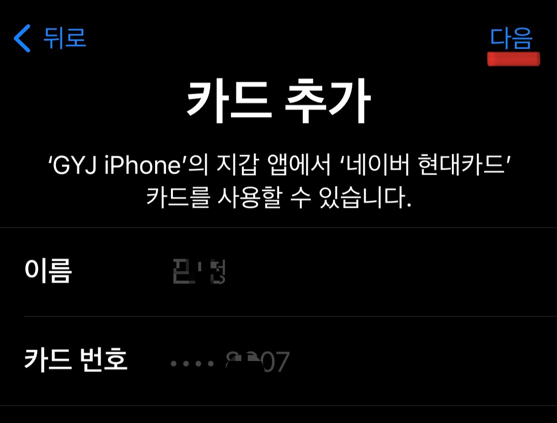 6. 카드추가 정보 확인하고 "다음"을 실행합니다.