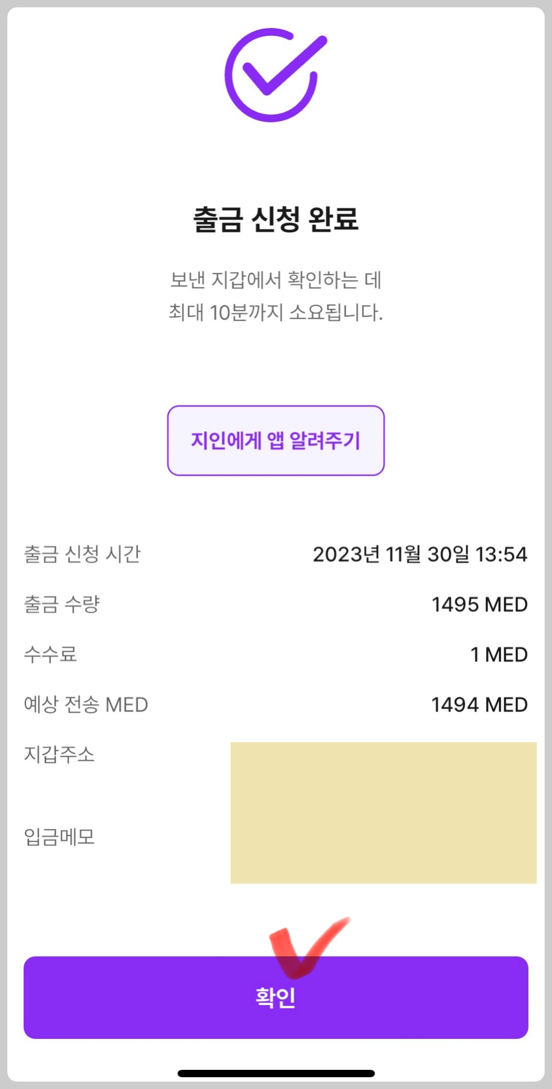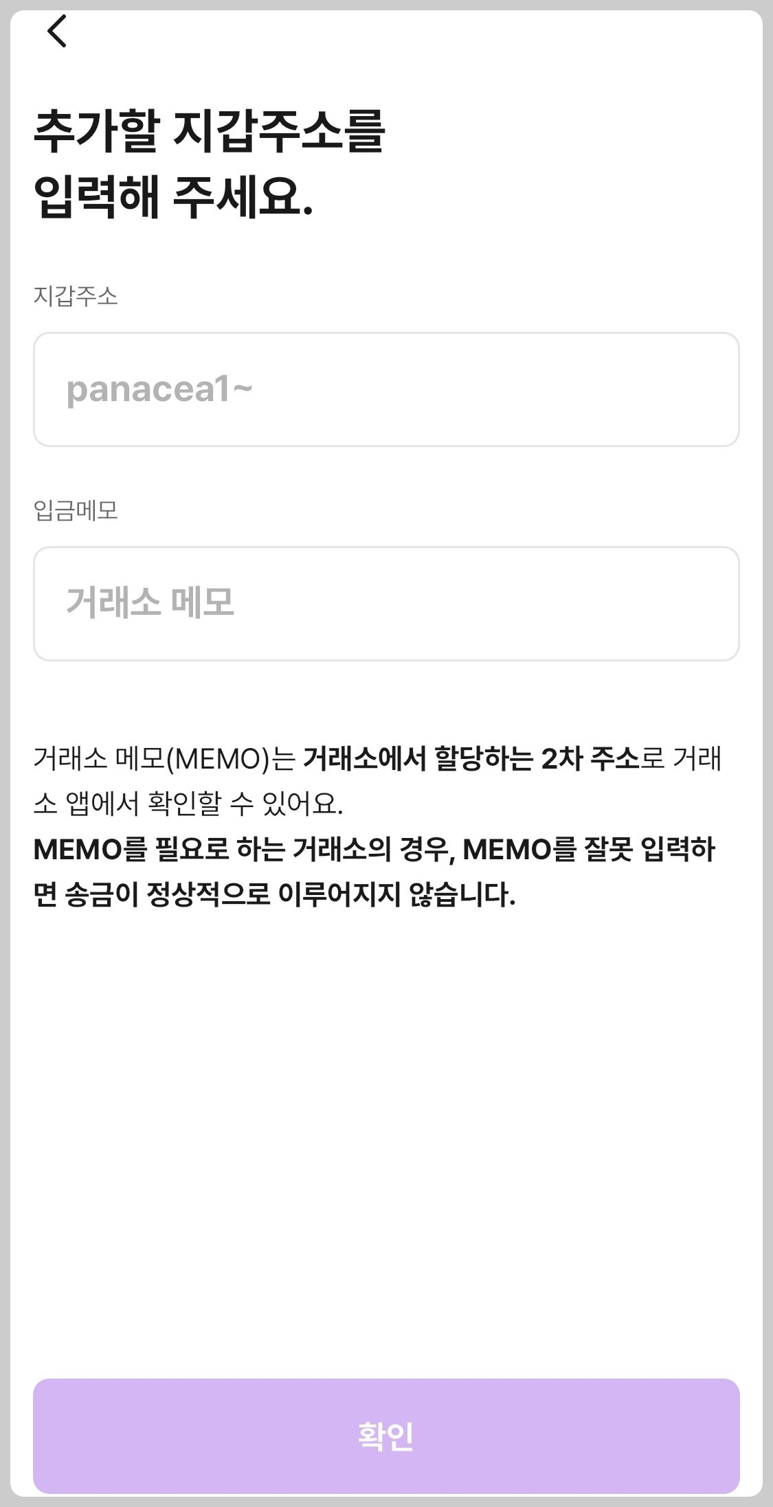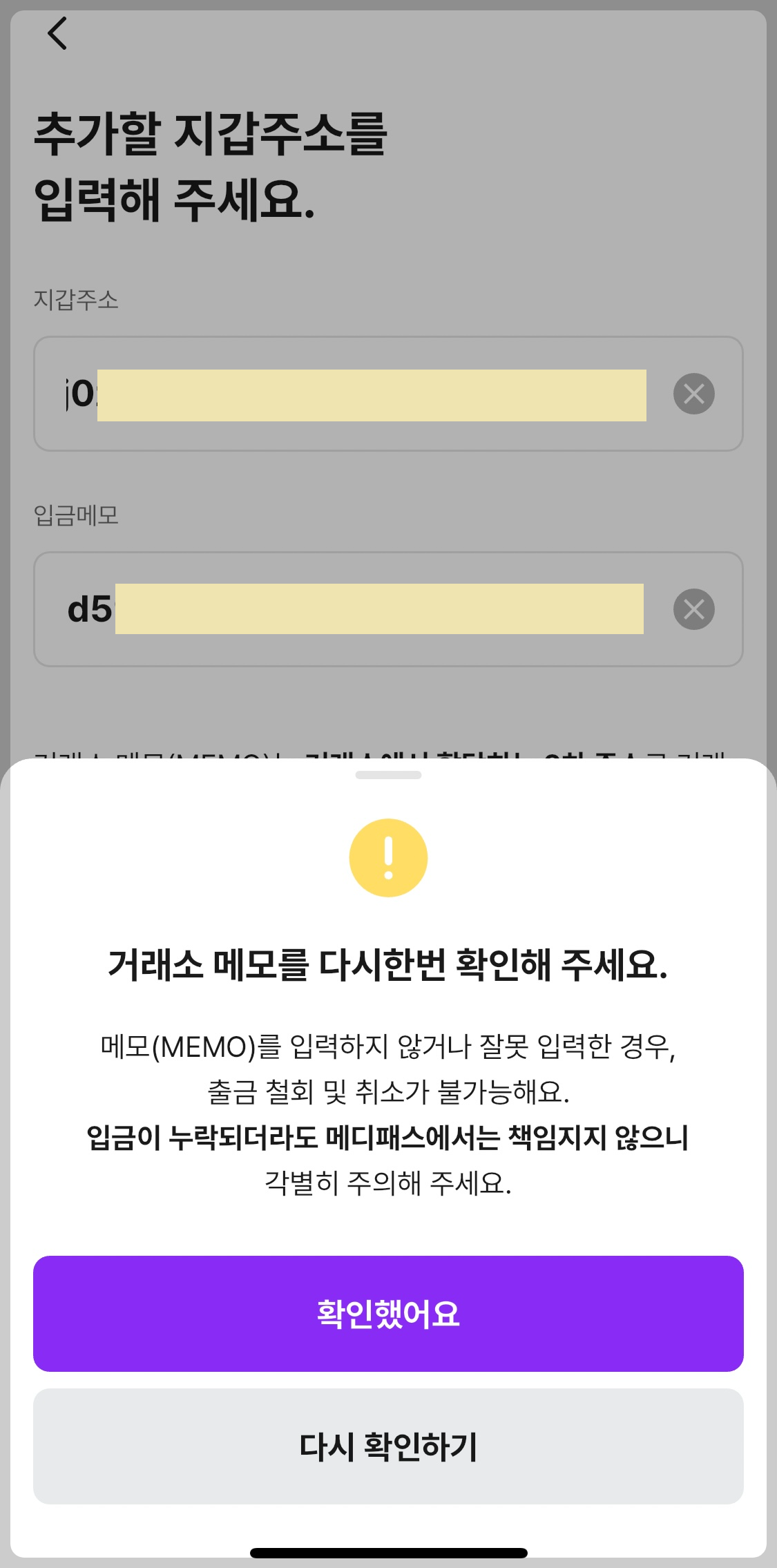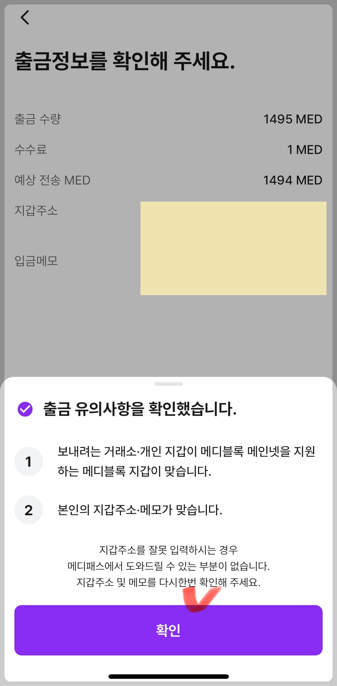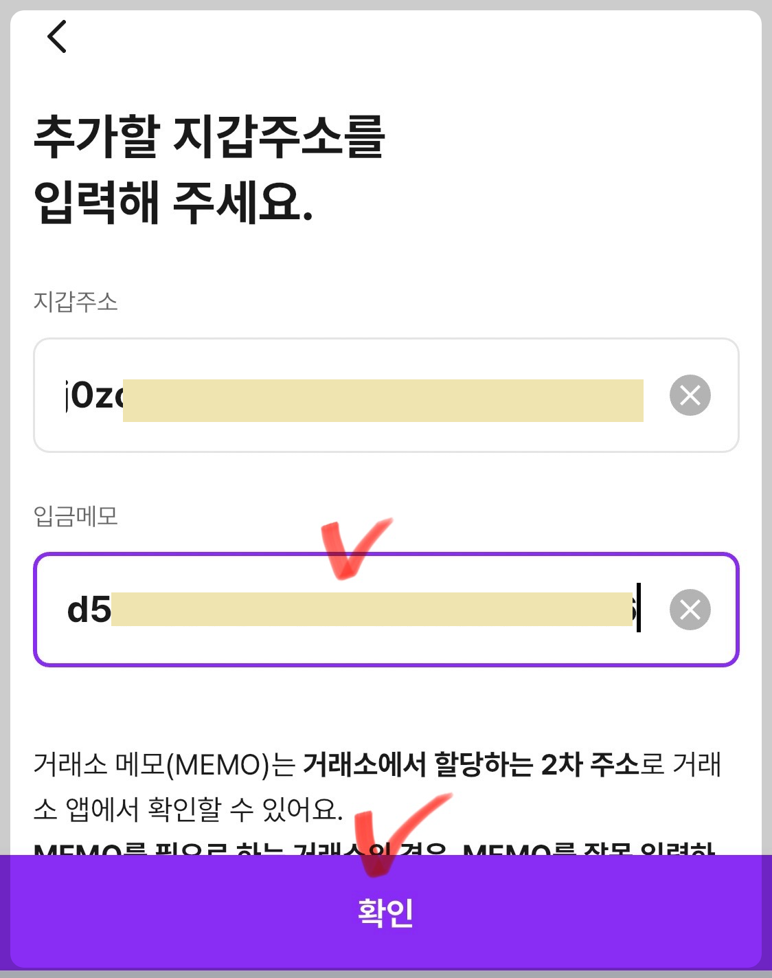 입금을 받을 지갑주소, 메모를 잘 입력해야 한다고 확인창이 나타납니다. “확인했어요”를 눌러줍니다.