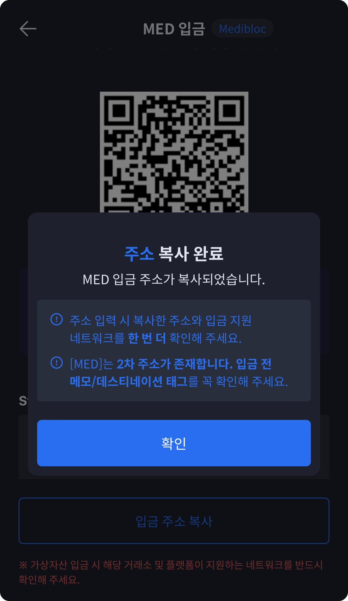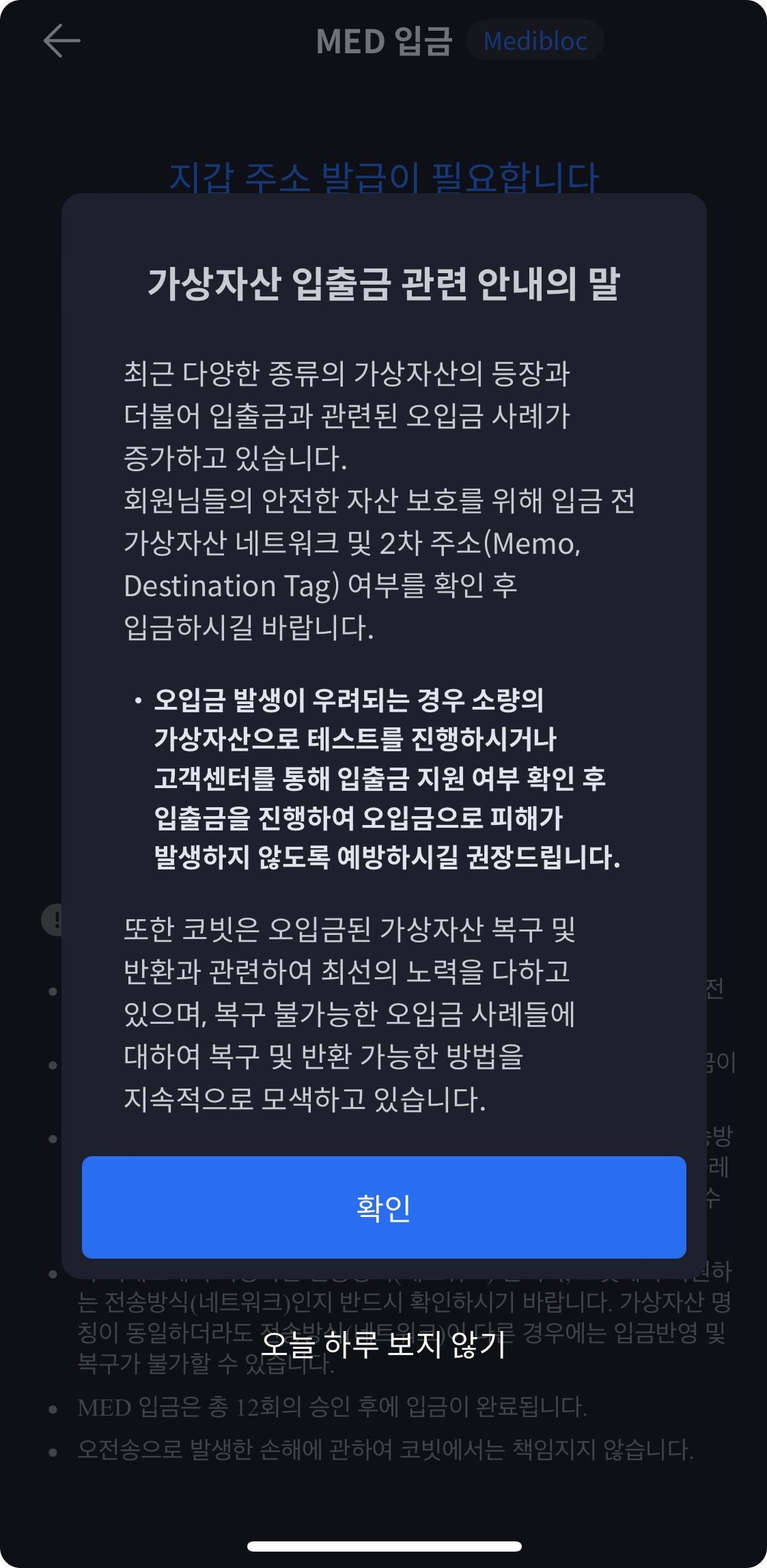 가상자산 입출금 관련 주의 안내 내용을 확인합니다. 오입금 사례가 많이 발생한다는 주의 안내 내용입니다. “확인”을 눌러줍니다.