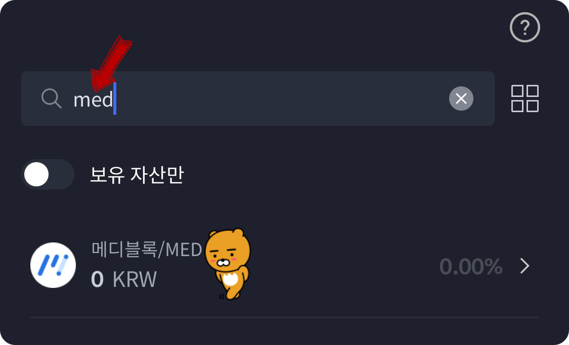 메디블록/MED 코인을 찾기 위해 “med”, “메디블록”을 입력하여 검색을 합니다.