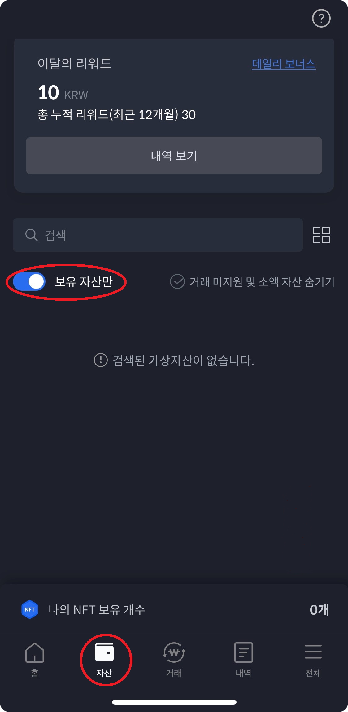 자산 화면은 기본으로 "보유 자산만"이 설정되어 있어 현재 내가 가지고 있는 자산만 보입니다.