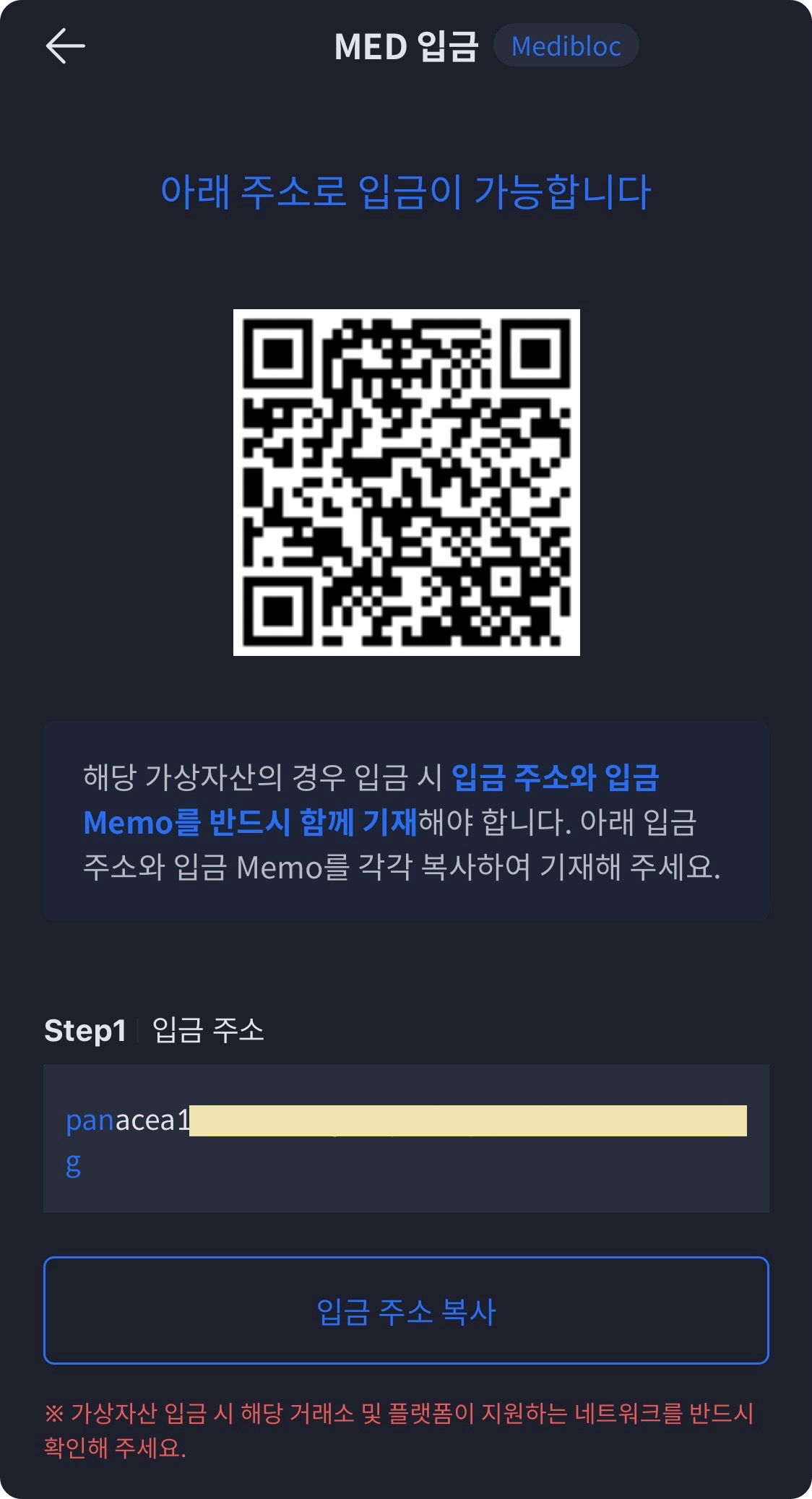 Step1 입금주소를 복사를 합니다. "입금 주소 복사" 눌러줍니다.