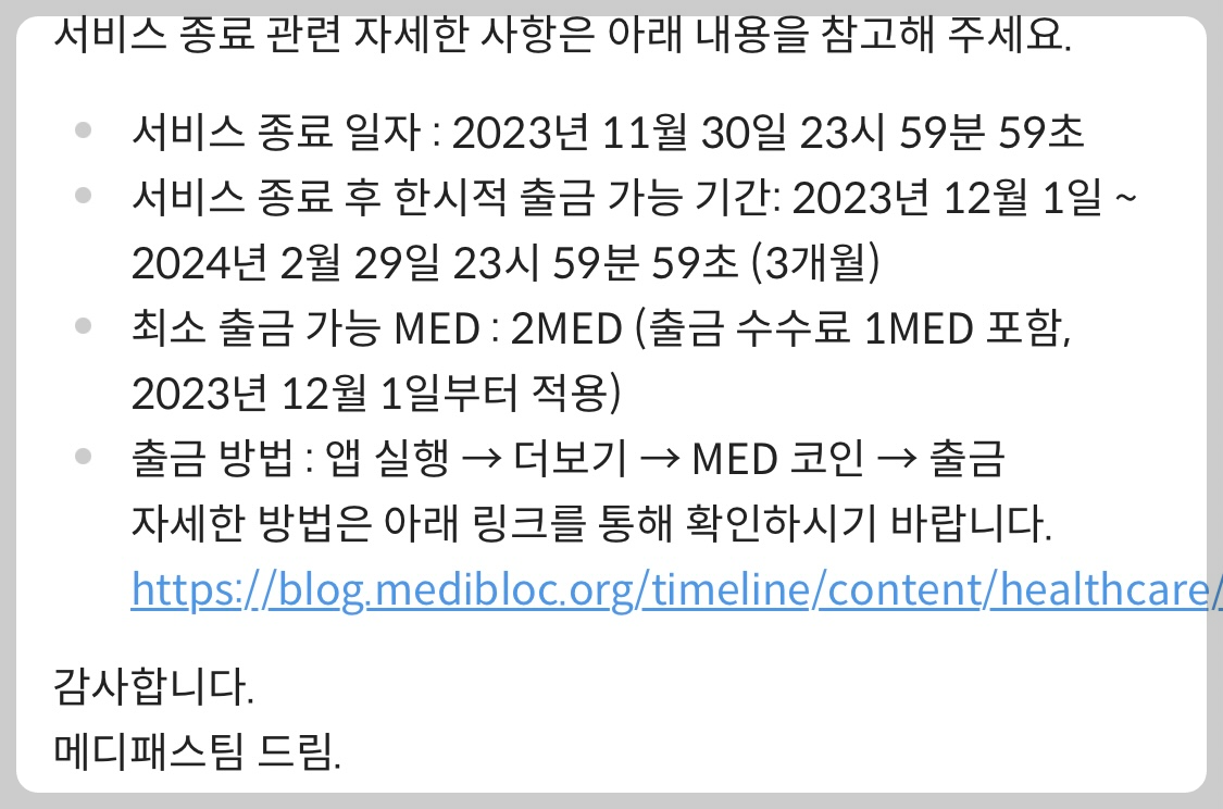 서비스 종료 후 한시적 출금 가능 기간은 2024년 2월 29일까지라고 합니다.