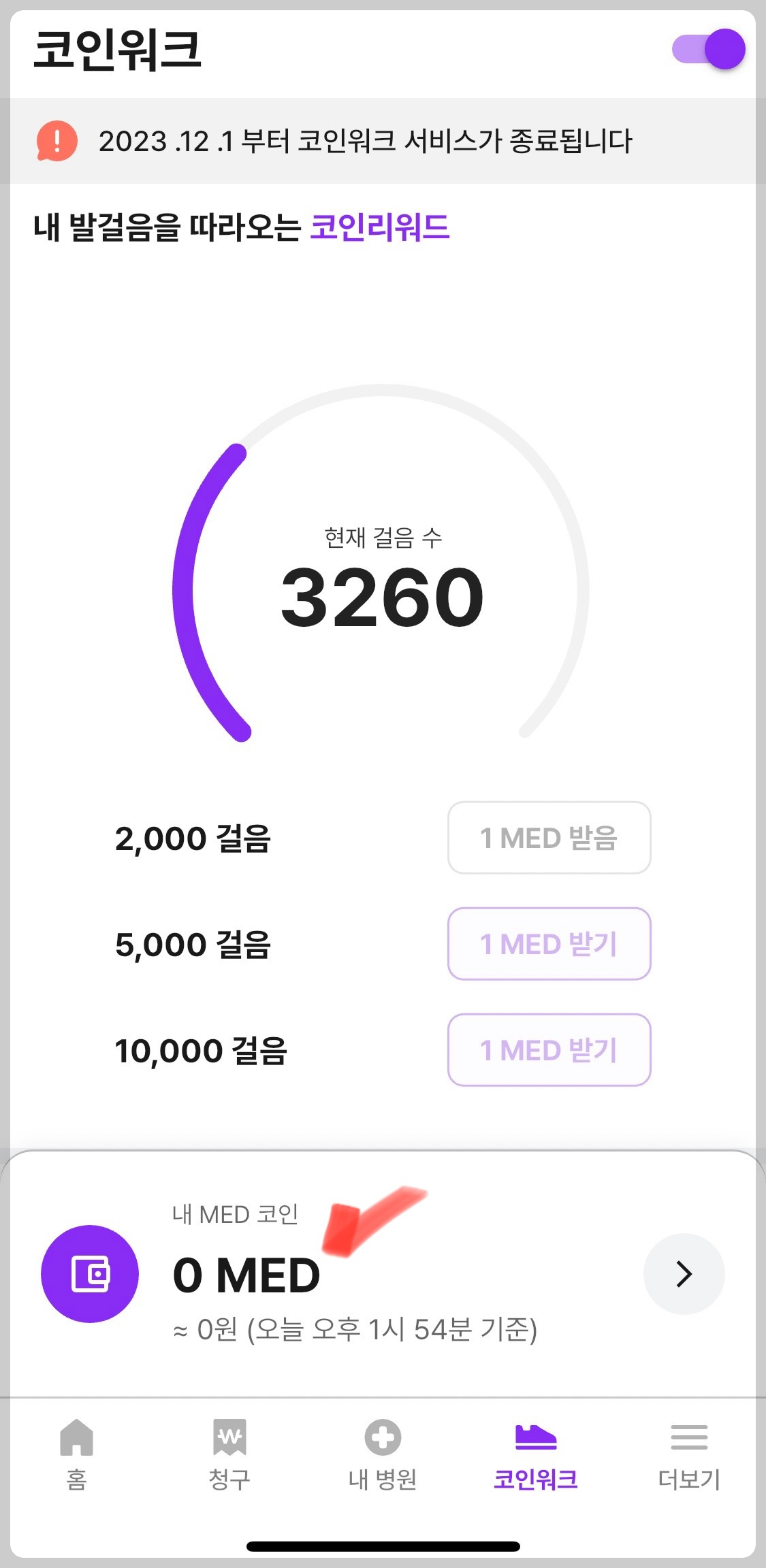 열심히 걷는 자에게 보상으로 받았던 코인은 원화로 출금이 가능합니다. 기존에는 200MED가 되어야 가능했었는데 서비스가 종료되면 1MED 수수료 발생으로 2MED 부터 출금이 가능해집니다.