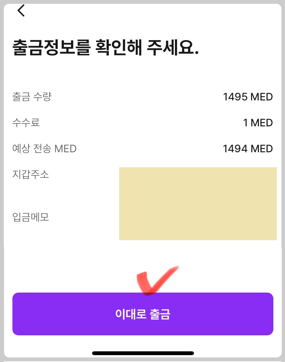 출금정보 지갑주소를 한 번 더 확인 후 하단 "이대로 출금"을 눌러줍니다.