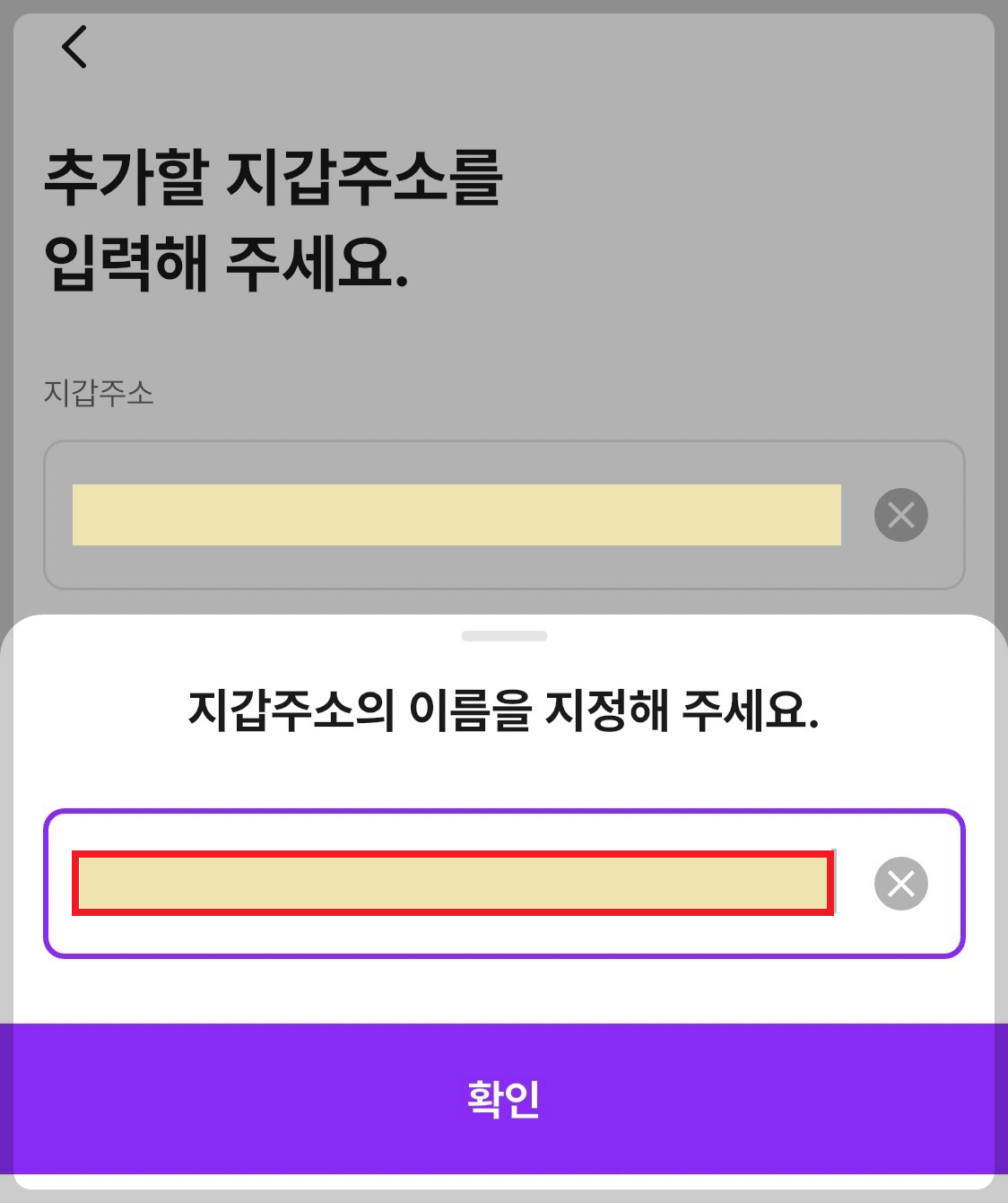지갑주소의 이름을 지정해 주세요.라는 화면에 위에서 복사한 지갑주소를 붙여넣기 합니다.